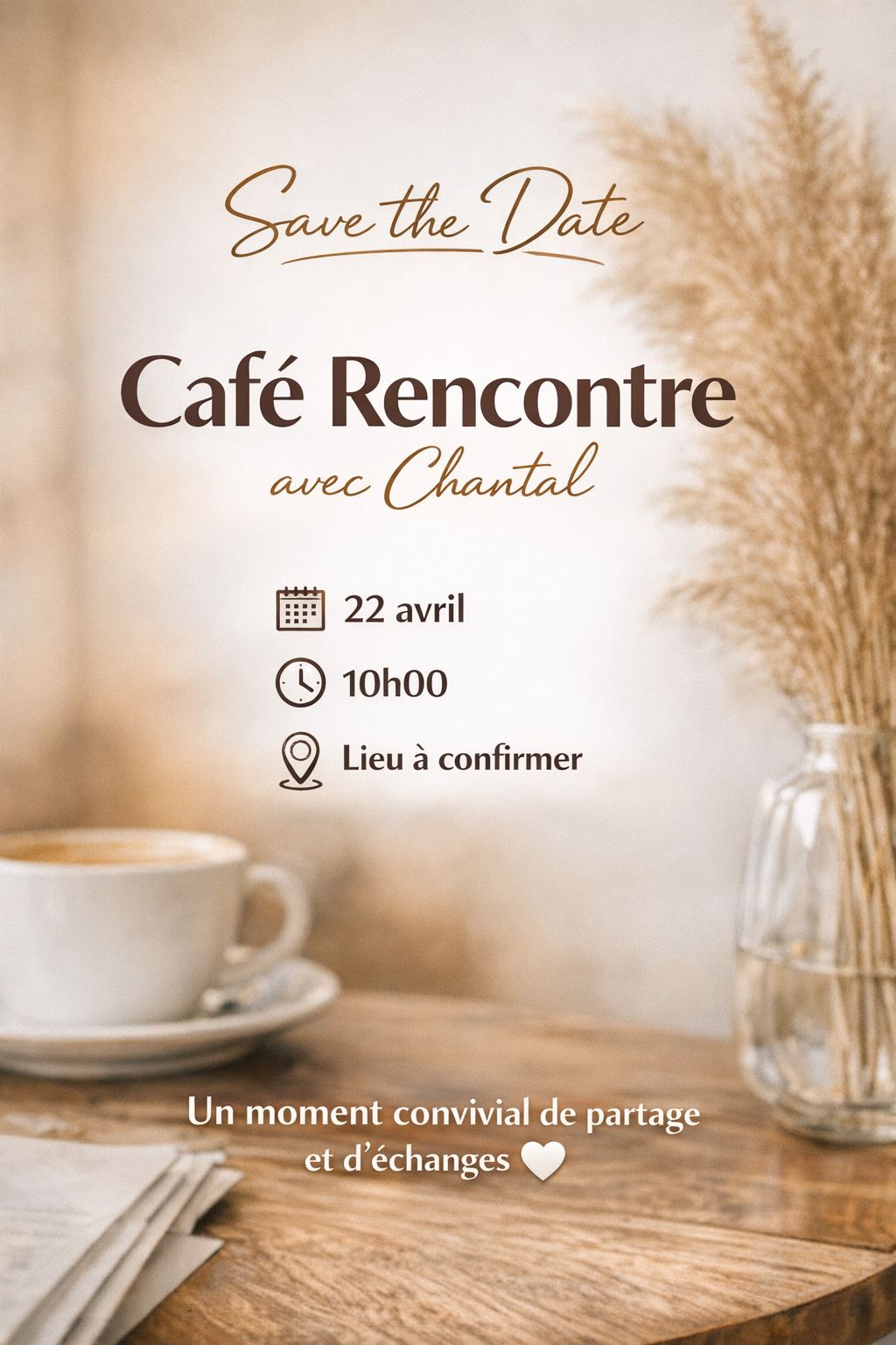 Rejoignez-nous pour un Café Rencontre avec Chantal, une belle occasion d’échanger, de partager et de créer du lien dans une ambiance chaleureuse.