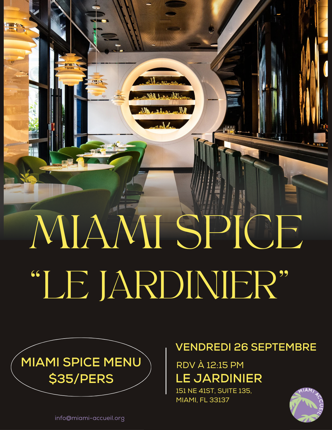 Miami Accueil vous donne rendez-vous le 26 septembre pour un déjeuner dans le cadre du programme Miami Spice au restaurant Le Jardinier, situé au cœur du Design District de Miami.